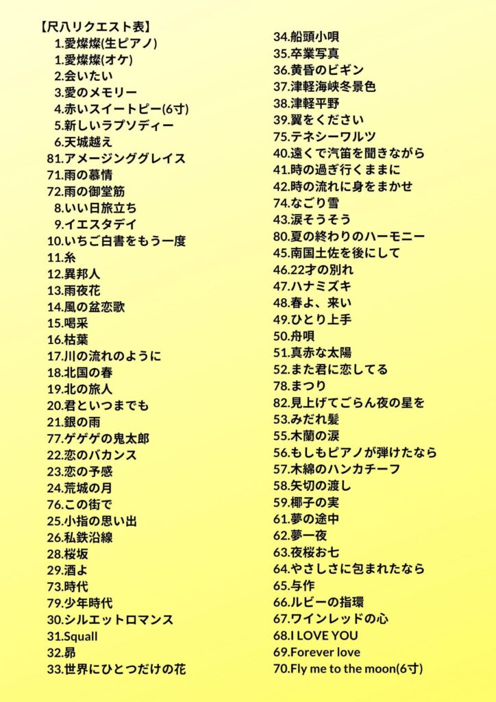 今回もすみねさん(と私)に生演奏してほしい曲を↓のリストの中からお選びいただき、その曲の番号と曲名、それから曲にまつわるエピソード等を添えて、お便りください♪