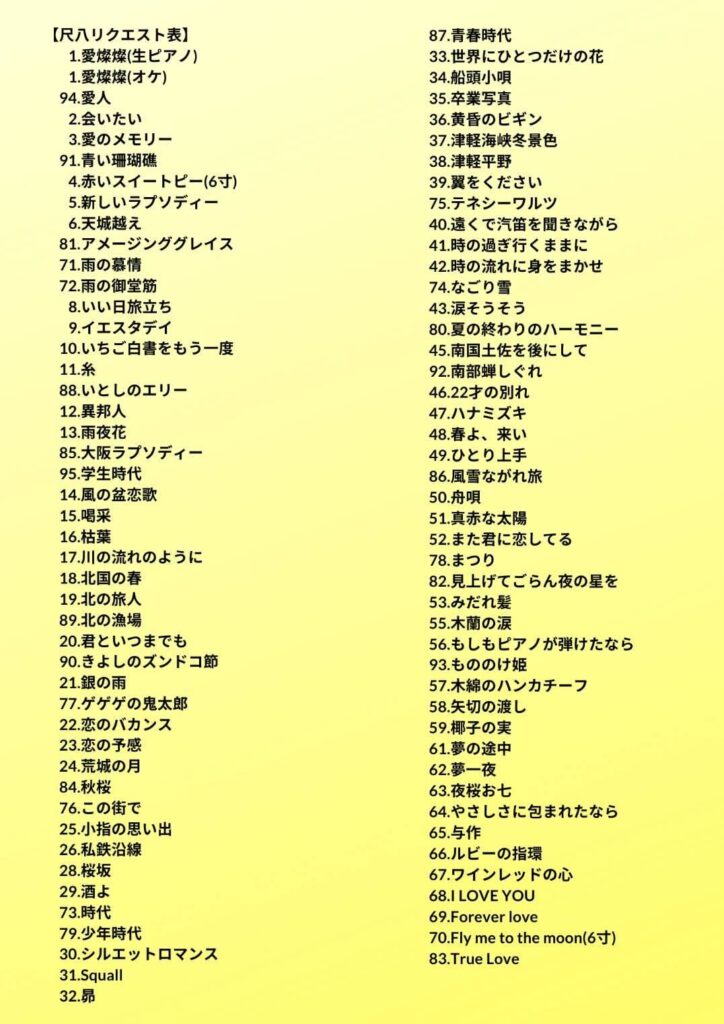 今回もすみねさん(と私)に生演奏してほしい曲を↓のリストの中からお選びいただき、その曲の番号と曲名、それから曲にまつわるエピソード等を添えて、お便りください♪