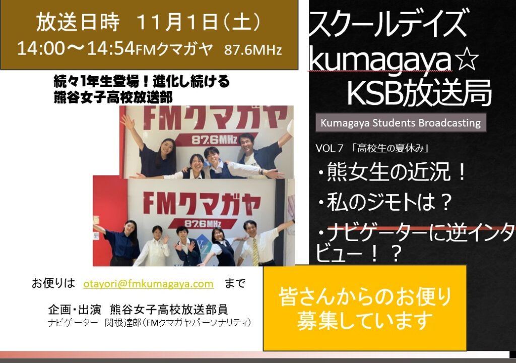 さて 11月1日(土)14:00~の『スクールデイズkumagaya☆KSB放送局』は?