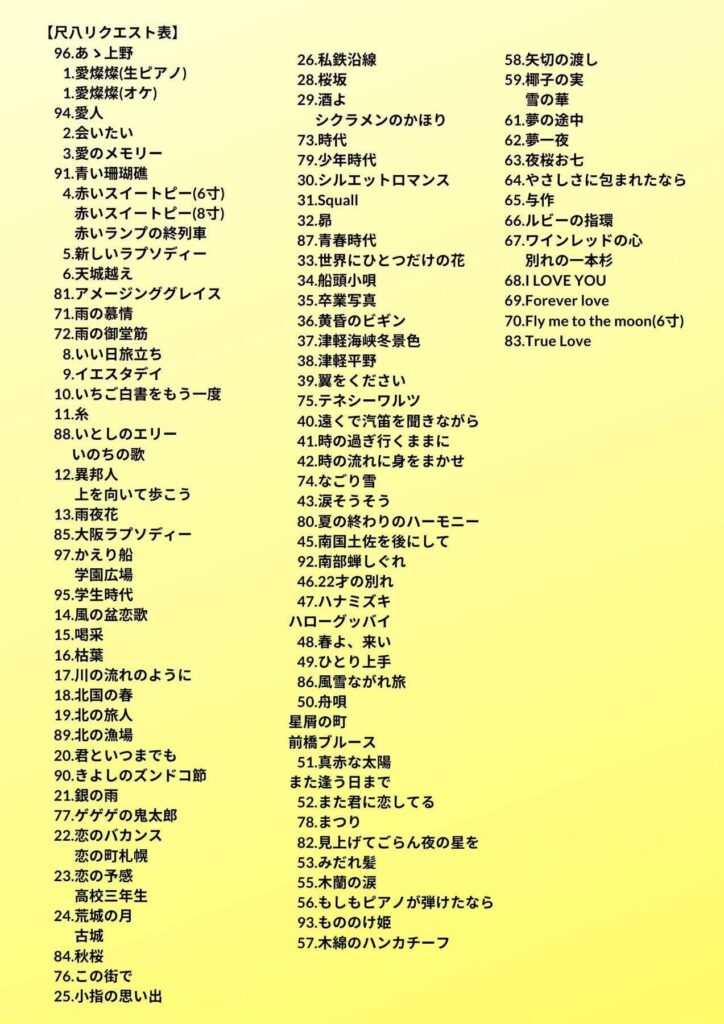 今回もすみねさん&私に生演奏してほしい曲を↓のリストの中からお選びいただき、番号と曲名、エピソード等をお送りください。